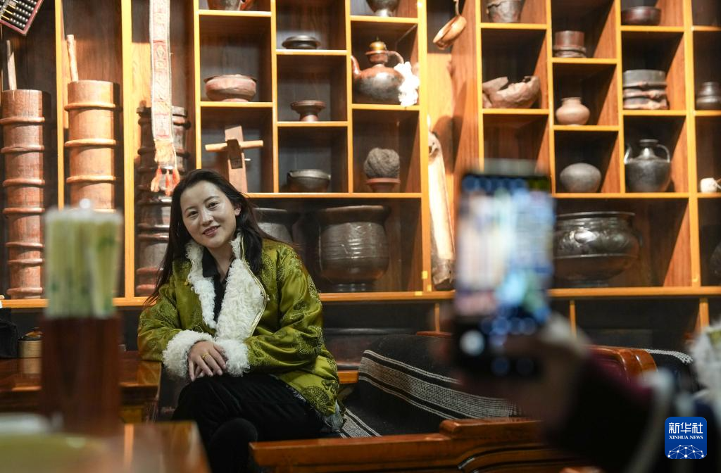 一名顧客在“牧人寶庫”茶館拍照留念(2月13日攝)。新華社記者 晉美多吉 攝
