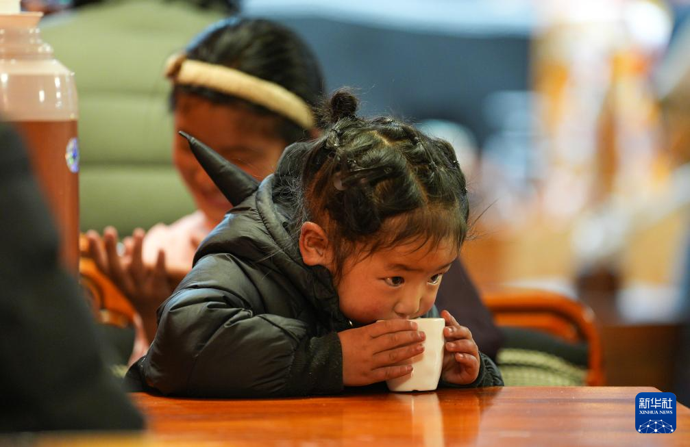 小顧客在“牧人寶庫”藏式茶館喝酥油茶(2月13日攝)。新華社記者 晉美多吉 攝
