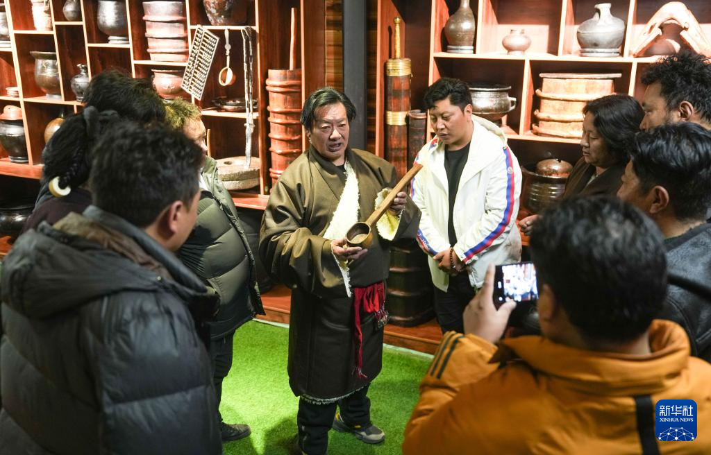 當(dāng)?shù)孛袼讓<邑暡悸逋ㄖ凶螅┰凇澳寥藢殠臁辈厥讲桊^給顧客講解館藏物件(2月13日攝)。新華社記者 晉美多吉 攝