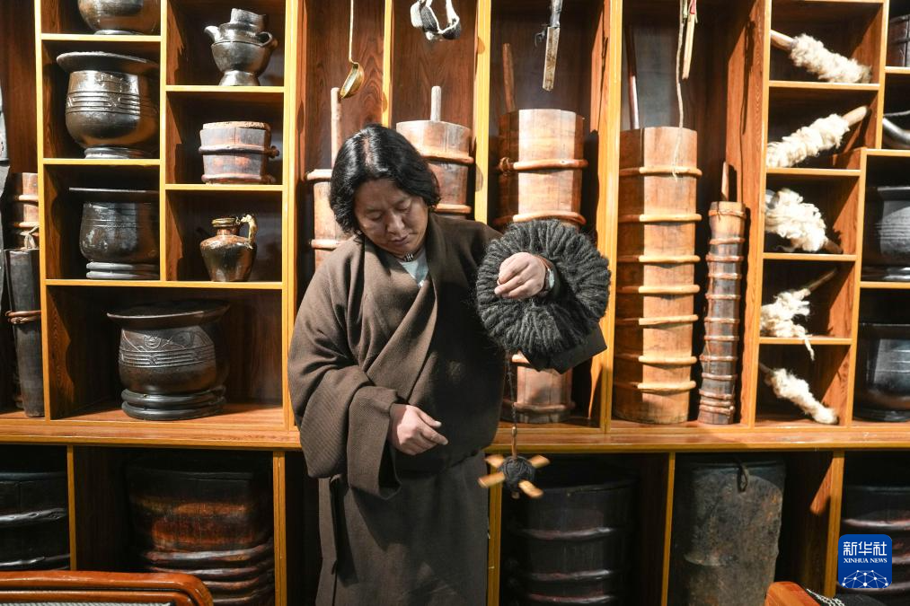 “牧人寶庫”藏式茶館主人珠珠演示紡羊毛線用的工具(2月13日攝)。新華社記者 晉美多吉 攝