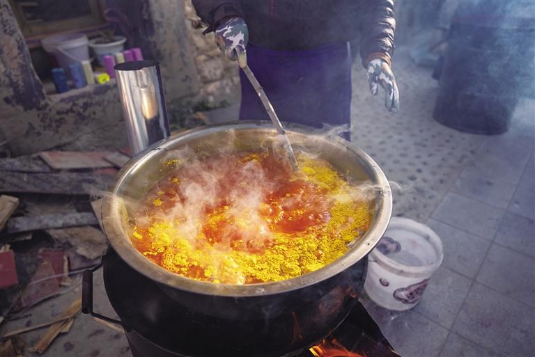 “玫紅色和黃色的都做完了吧?這個顏料水我倒了,開始準備制作青色?!币慌?,61歲的央金將盆洗干凈,繼續(xù)煮水放入顏料?!啊_薩梅朵’有青色、綠色、玫紅色、黃色四種顏色,其中青色耗時最長,不僅需要自己調制,而且最難上色?!毖虢鹫f,“我們一般是早上7點開始上色,上完色都快下午4點了?!?/p>