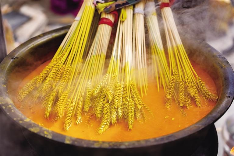 從金黃到色彩斑斕,“羅薩梅朵”的制作需要經過收割、曬干、上色等數道工序,這是桑木村村民傳承至今的手藝。熱氣騰騰的顏料鍋旁,年輕的媳婦正在煮顏料;曬干的“羅薩梅朵”堆在一旁,一位奶奶和她的孫子正在有序捆綁。廣場上,年齡最大的村民近70歲,最小的12歲,年輕人從老一輩手中接過了文化傳承的接力棒。