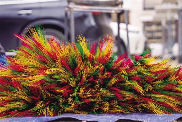 “銷量好的時候一天可以賣近1000元,一般的時候也有500元左右?!毖虢鹱屑殭z查著剛染好色的“羅薩梅朵”,她的手和臉因長時間接觸顏料而沾滿色彩?!耙郧啊_薩梅朵’的顏色并不多,只有玫紅色,上色不均勻也沒人會說什么。但現(xiàn)在,顏色必須亮麗、均勻,這也體現(xiàn)了大家生活越來越好,生活品質越來越高?!毖虢鹦χf。