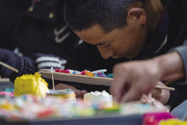記者看到,捏酥油花的主要工序十分復(fù)雜。藝人們先制作盾形木板作為酥油花的“骨架”,支撐著整個作品的形態(tài)。當(dāng)天,在幾十平方米的出租屋內(nèi),大家圍坐在墻邊,面前擺放著調(diào)制好的各色酥油和一盆盆清水。藝人們盤腿而坐,進入“敷塑”階段:他們在加工成膏狀的乳白色酥油中揉進各色礦物質(zhì)顏料,調(diào)和成五顏六色的油塑原料,接著熟練地捏取酥油在冷水中浸泡,然后用指尖不斷揉捻、塑形,不時還用小木刀進行精細(xì)加工。隨后,在做好的酥油花上微灑清水,使其更加堅固且璀璨奪目。在他們的巧手下,一塊塊酥油很快就變成了日月、花瓣以及猴、象、兔、鳥等各種形狀。為了防止酥油融化,他們不停地將手放入冰水中降溫。
