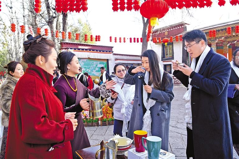 隨著一聲聲“扎西德勒!”“新年快樂(lè)!”的祝福語(yǔ)響起,身著盛裝的工作人員站在切瑪盒旁邊,熱情地教游客吃“切瑪”?!扒鞋敗焙欣餄M滿的青稞粒和糌粑,再加上金燦燦的酥油花和染成紅綠兩色的“羅薩梅朵”麥穗的裝點(diǎn),象征著五谷豐登、福澤綿長(zhǎng)。來(lái)自廣東的游客張女士一家是專程趕來(lái)過(guò)藏歷新年的,想來(lái)體驗(yàn)不同年味兒的她輕捏一撮切瑪撒向空中:“愿我們?nèi)医】灯桨?,也祝祖?guó)繁榮昌盛!”