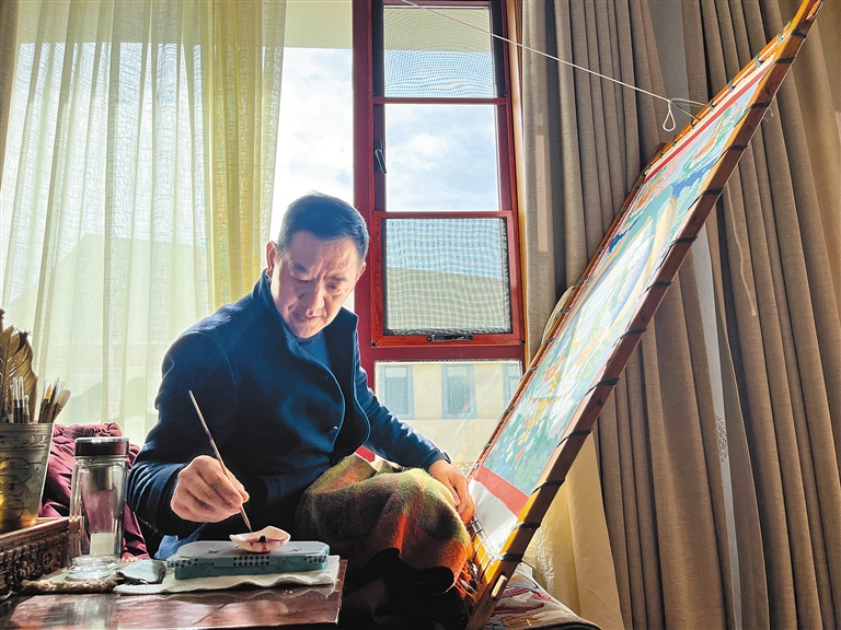 全國政協(xié)委員勉沖·羅布斯達是藏族唐卡勉薩畫派國家級非物質(zhì)文化遺產(chǎn)的代表性傳承人,中國工藝美術(shù)大師,40多年來,勉沖·羅布斯達致力于唐卡藝術(shù)的保護與傳承,培養(yǎng)了400余名高水平唐卡繪制人才。由他創(chuàng)辦并擔任院長的西藏唐卡畫院,目前已列入國家級非物質(zhì)文化遺產(chǎn)名錄藏族唐卡“勉薩派”保護單位。