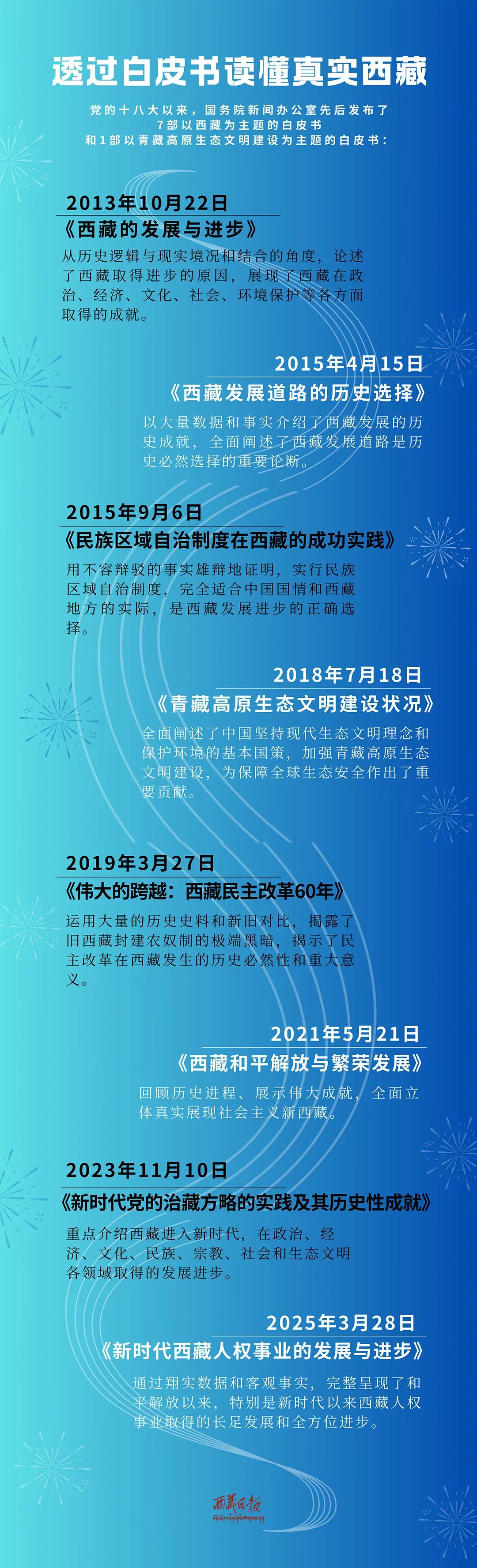 2023年發(fā)布《新時(shí)代黨的治藏方略的實(shí)踐及其歷史性成就》白皮書(shū),系統(tǒng)總結(jié)和全面闡述了在新時(shí)代黨的治藏方略引領(lǐng)下,西藏在政治、經(jīng)濟(jì)、文化、民族、宗教、社會(huì)和生態(tài)文明各領(lǐng)域取得的發(fā)展進(jìn)步。新時(shí)代西藏的發(fā)展與進(jìn)步,充分證明了新時(shí)代黨的治藏方略是完全正確的。