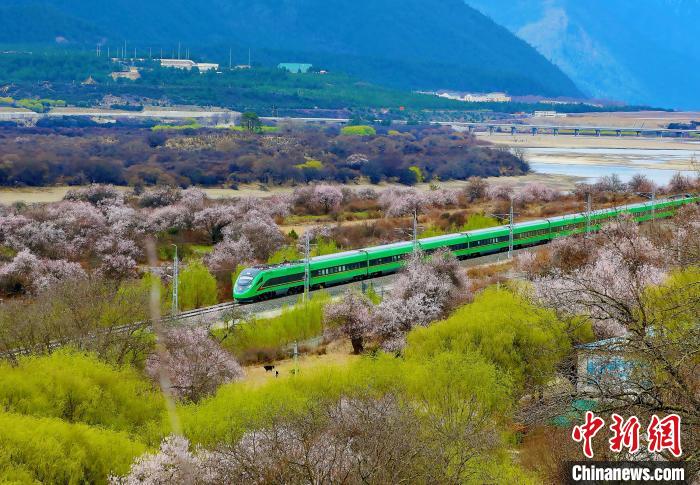 圖為飛馳在拉林鐵路桃花密林間的復(fù)興號列車。馬生明 攝