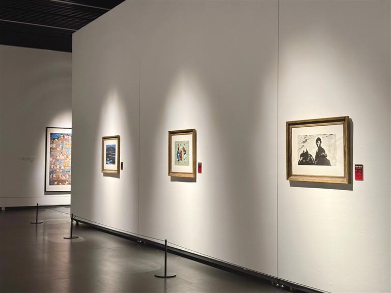 步入展廳,經(jīng)典版畫與“藏族祥巴”作品交相輝映。作為展覽的重頭戲,“藏族祥巴”融合傳統(tǒng)繪畫與版畫技法,色彩濃烈、紋樣繁復(fù),生動(dòng)展現(xiàn)藏族民俗風(fēng)情與精神內(nèi)涵;經(jīng)典版畫則以多元風(fēng)格,記錄時(shí)代變遷與地域特色,既有細(xì)膩寫實(shí)的生活圖景,也有充滿張力的抽象表達(dá)。