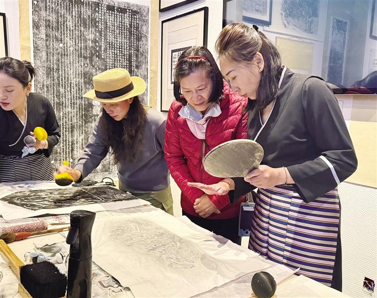 國際旅行商在日喀則石刻藝術博物館內(nèi)體驗拓片技藝。記者 張琳 攝