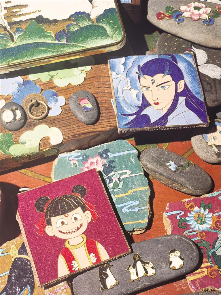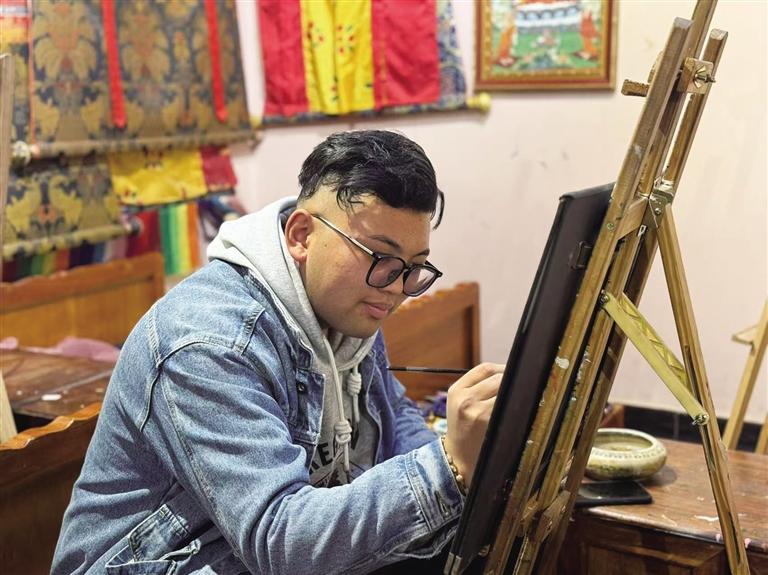 只見占地不到20平方米的小屋內(nèi),擺放著各類唐卡畫作。既有傳統(tǒng)唐卡作品,亦有動畫人物的“繪像”。描邊的金屬絲和光滑的質(zhì)感表面讓人忍不住駐足欣賞。店里陳列著巴掌大小的掐絲唐卡,金線掐絲在礦物顏料映襯下流光溢彩。畫師兼老板的南吉合多杰正在完成一份岡仁波齊的客單:“勉薩畫派的特色是線條細膩,顏色過渡自然。選好圖案后,會根據(jù)載體材質(zhì)、大?。ɡ缡^大小、木板長短等)收費。”他一邊說著,一邊用特制工具將顏料注入金絲隔斷。