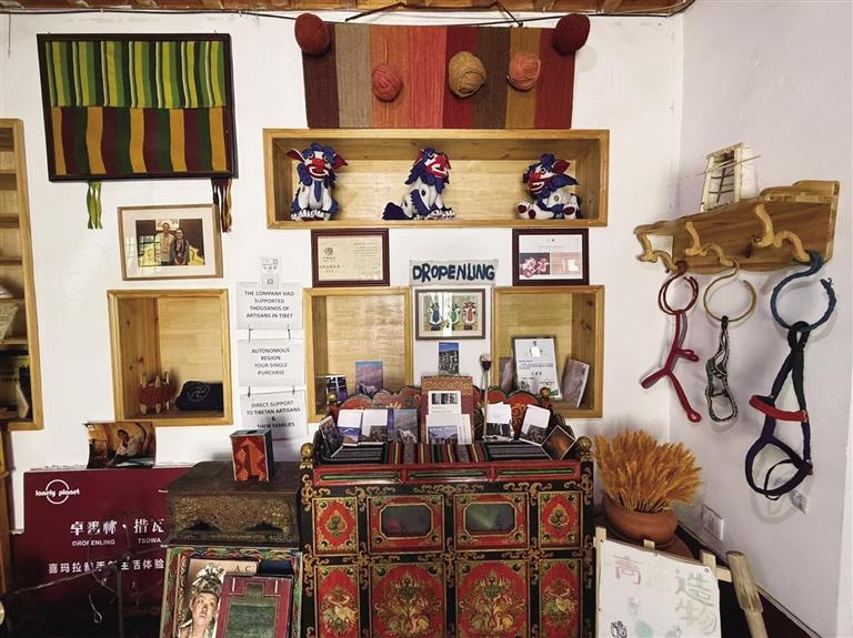 進入卓番林,只見狹長的店面內(nèi)琳瑯滿目地擺著各類富有藏元素的物件,里側(cè)的木質(zhì)貨架上整齊掛著多條不同顏色和格紋樣式的織物,貨架上方擺放著展示手工編織過程的照片。工作人員告訴記者,這些都是可售賣的,除此之外,游客來到這里,還可以體驗酥油香皂、酥油唇膏、藏式刺繡等手工DIY。