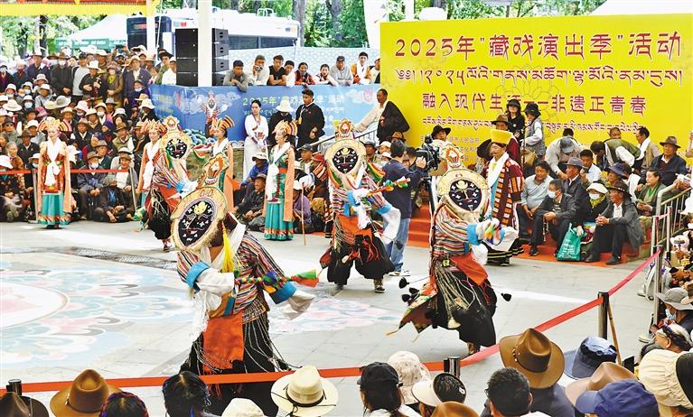 6月13日,以“融入現(xiàn)代生活——非遺正青春”為主題的2025年“藏戲演出季”活動在拉薩市宗角祿康公園舉行。本次活動由非遺體驗、產(chǎn)品展銷、藏戲展演三個部分組成,精彩的表演吸引了眾多市民游客觀看。 圖為活動現(xiàn)場,拉薩市堆龍德慶區(qū)措麥藏戲隊帶來的藏戲劇目《智美更登》。記者 旦增蘭澤 攝
