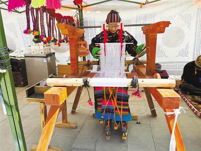 在措美縣非遺展示活動現(xiàn)場,扎雜村村民在演示織氆氌。
