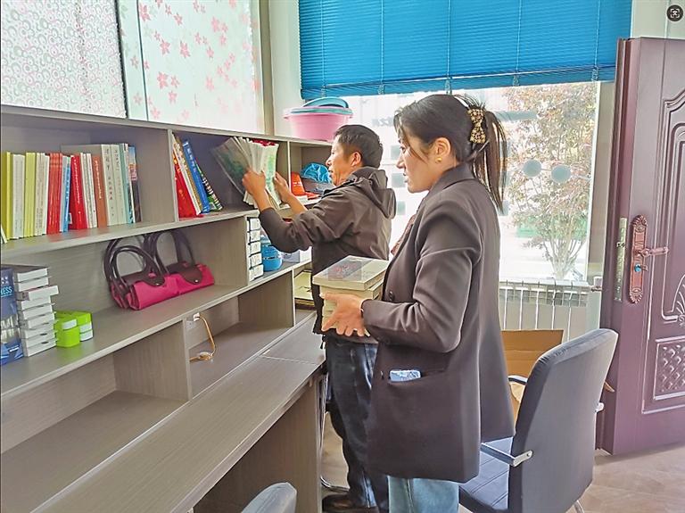 圖為措美鎮(zhèn)當許社區(qū)黨員志愿者在驛站內擺放圖書和充電器等供群眾免費使用。記者 丹增平措 攝
