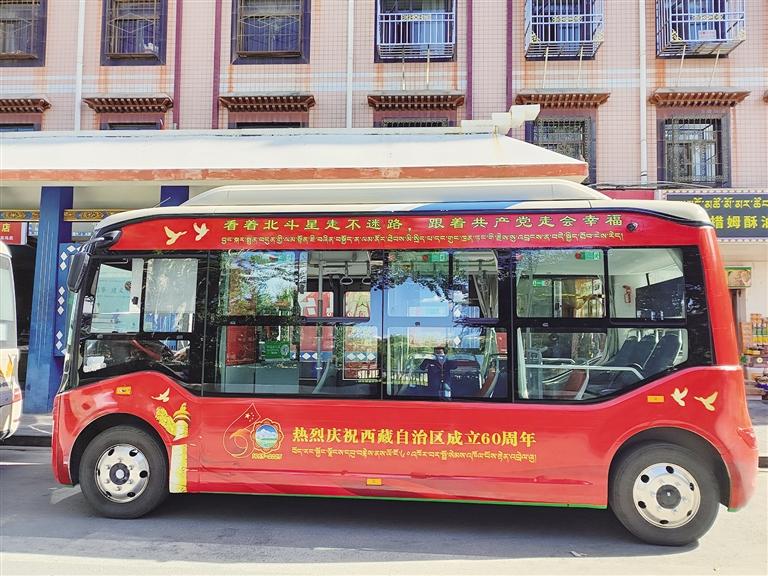 除此之外,W03微循環(huán)公交車的車身、車頭、車內(nèi)等顯眼位置,都精心張貼了藏漢雙語宣傳標(biāo)語、海報(bào)及大慶標(biāo)識(shí);車尾的LED顯示屏還循環(huán)播放著“慶祝西藏自治區(qū)成立60周年”公益宣傳片,進(jìn)一步營造了濃厚的慶祝氛圍。這些宣傳內(nèi)容簡潔有力、直擊人心,生動(dòng)地表達(dá)了西藏人民對(duì)黨的感恩之情,以及對(duì)西藏自治區(qū)成立60周年的衷心祝福。