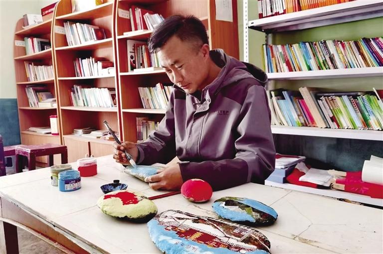 張銀波駐村期間,通過手繪石頭畫慶祝中國共產黨成立100周年。