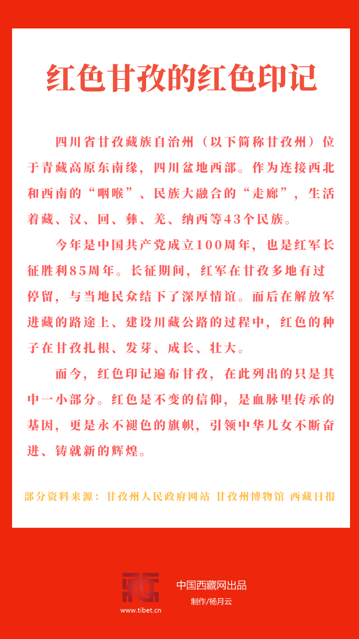 今年是中國(guó)共產(chǎn)黨成立100周年,也是紅軍長(zhǎng)征勝利85周年。長(zhǎng)征期間,紅軍在甘孜多地有過停留,與當(dāng)?shù)孛癖娊Y(jié)下了深厚情誼。而后在解放軍進(jìn)藏的路途上、建設(shè)川藏公路的過程中,紅色的種子在甘孜扎根、發(fā)芽、成長(zhǎng)、壯大。