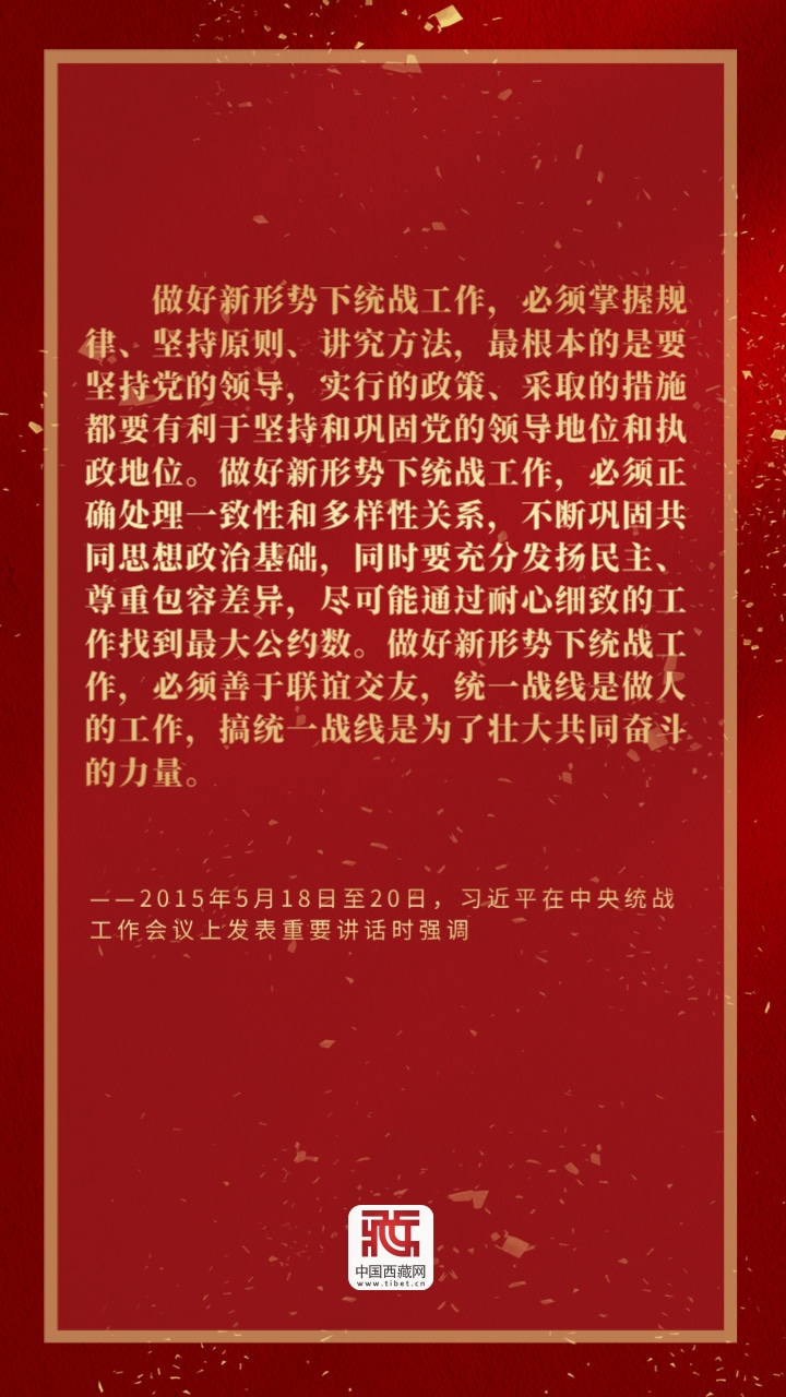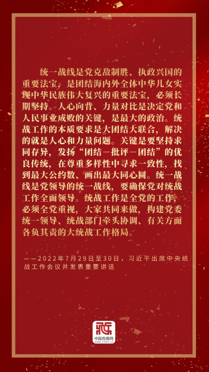 統(tǒng)一戰(zhàn)線是中國(guó)共產(chǎn)黨在中國(guó)革命中戰(zhàn)勝敵人的一個(gè)重要法寶。黨的十八大以來,以習(xí)近平同志為核心的黨中央把統(tǒng)一戰(zhàn)線和統(tǒng)戰(zhàn)工作擺在全黨工作的重要位置,努力團(tuán)結(jié)一切可以團(tuán)結(jié)的力量、調(diào)動(dòng)一切可以調(diào)動(dòng)的積極因素,畫出最大同心圓,為黨和人民事業(yè)不斷發(fā)展?fàn)I造了十分有利的條件。讓我們一起品讀習(xí)近平總書記關(guān)于統(tǒng)戰(zhàn)工作的“金句”,以此為指南,凝聚團(tuán)結(jié)奮進(jìn)力量,不斷開創(chuàng)統(tǒng)戰(zhàn)工作新局面!(中國(guó)西藏網(wǎng) 編輯/周晶 孫健 制作/歐帆)