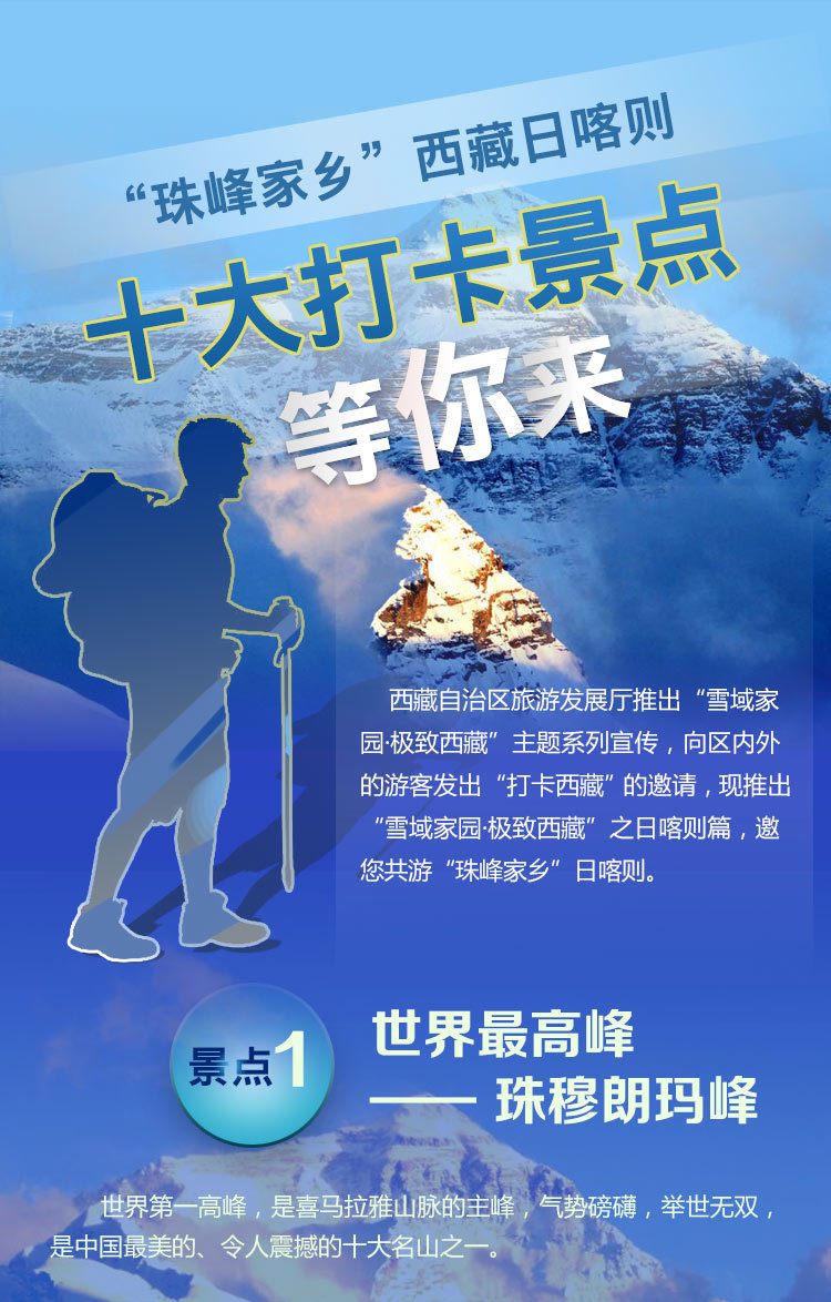 西藏自治區(qū)旅游發(fā)展廳推出“雪域家園·極致西藏”主題系列宣傳,向區(qū)內(nèi)外的游客發(fā)出“打卡西藏”的邀請(qǐng),現(xiàn)推出“雪域家園·極致西藏”之日喀則篇,邀您共游“珠峰家鄉(xiāng)”日喀則。 [詳細(xì)] -
