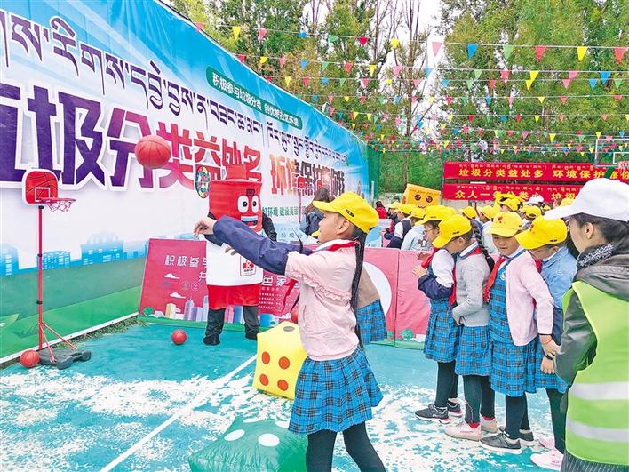 在拉薩市城關(guān)區(qū)組織開(kāi)展的“不忘初心、牢記使命”主題教育暨“垃圾分類黨員先行 守護(hù)凈土人人有責(zé)”活動(dòng)現(xiàn)場(chǎng),學(xué)生代表參加趣味游戲。