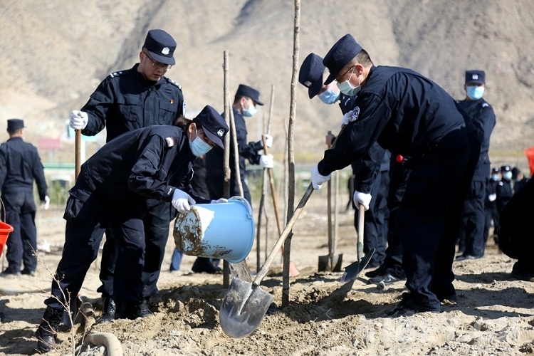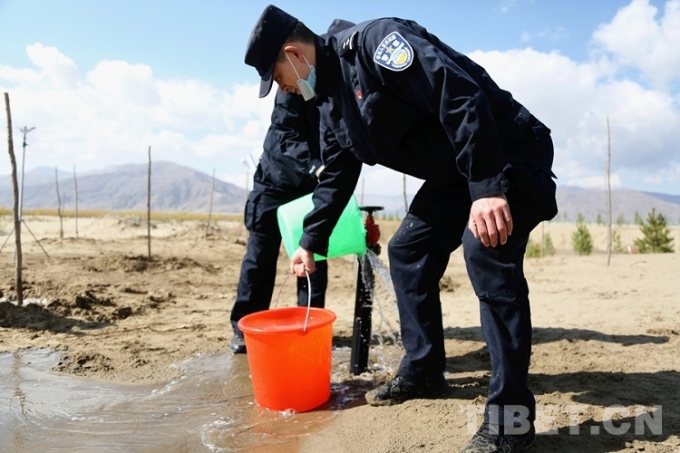 4月9日,民警們肩扛樹苗和鉆坑機,手持鐵鍬和水桶,再次來到雅魯藏布江畔的沙漠地帶,開展義務植樹公益活動。