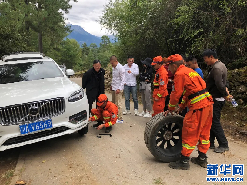 森林消防指戰(zhàn)員為游客換輪胎。新華社發(fā)(西藏森林消防總隊(duì)提供)