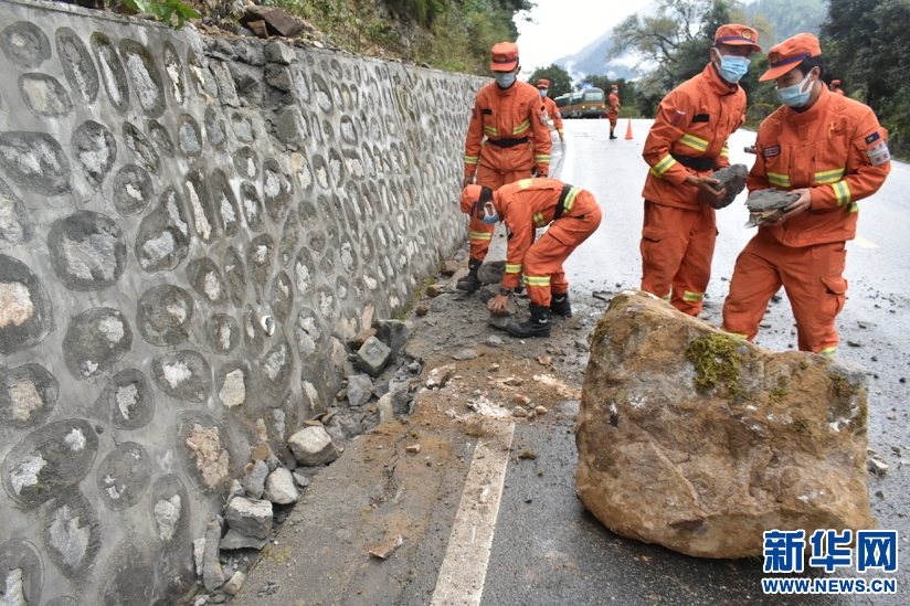 森林消防指戰(zhàn)員搬離滾石排除安全隱患。新華社發(fā)(西藏森林消防總隊(duì)提供)
