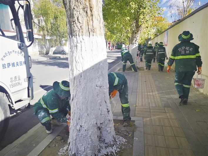 西藏拉薩市區(qū)近4萬(wàn)棵樹(shù)木涂白換“冬裝”