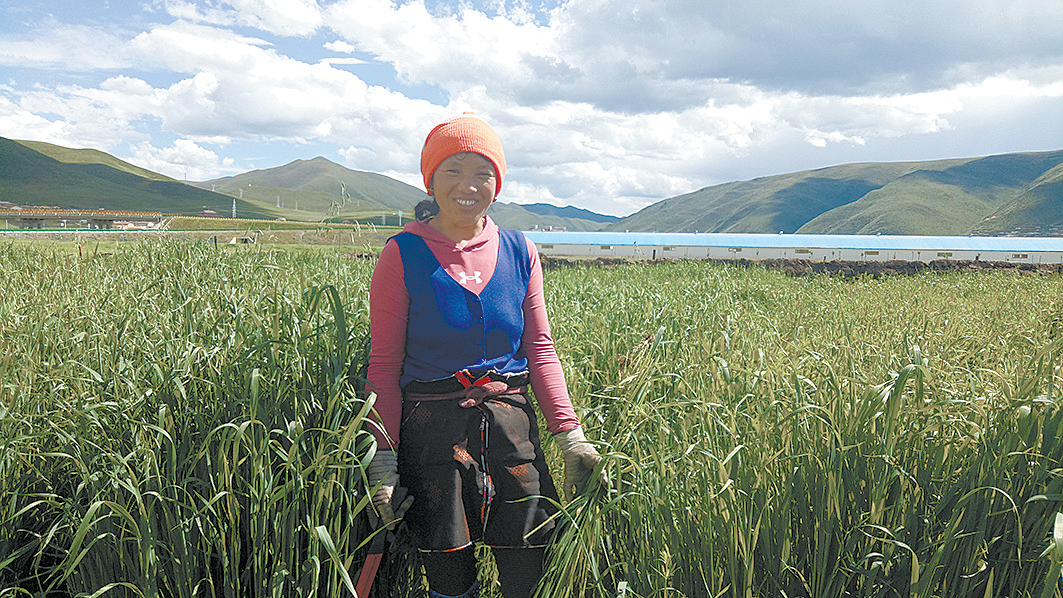澤白是門堂鄉(xiāng)門堂村的貧困戶,家里有四口人,這些年,得益于草原補(bǔ)助、生態(tài)管護(hù)員等脫貧政策,澤白家于2016年脫貧。禁牧實(shí)施以來,澤白和丈夫種植了0.3公頃(五畝)草地早熟禾,當(dāng)記者見到澤白時(shí),她正在一片綠油油的田地間“揮舞”著鐮刀,身邊已有好幾摞割好的早熟禾。