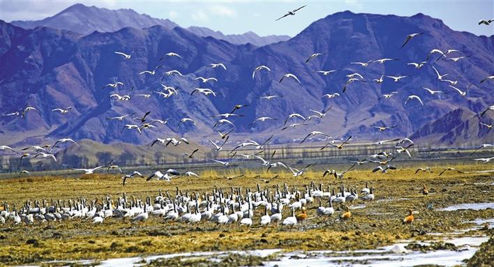 在冬日暖陽的照耀下,成群結(jié)隊的鳥兒在河面上、濕地里盡情嬉戲,赤麻鴨悠然戲水、斑頭雁低聲吟唱、黑頸鶴翩翩起舞……一派熱鬧的景象。
