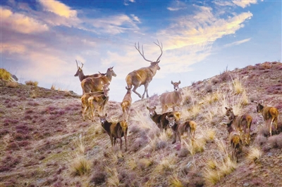 圖為在德令哈市雅撒圖地區(qū)成群結(jié)隊的白唇鹿在山上自由奔跑、覓食?!〈饔婪濉z