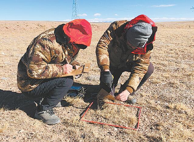 在另一塊平整的草地上,中科院西北高原生物研究所的賀福全和同伴正在采集植被樣本。賀福全說(shuō),他們的主要目標(biāo)是了解這個(gè)區(qū)域草的長(zhǎng)勢(shì)情況,并將植被樣本帶回實(shí)驗(yàn)室進(jìn)行分析,針對(duì)這塊草地的承載能力,測(cè)量草地產(chǎn)量,給直升機(jī)和無(wú)人機(jī)做地面驗(yàn)證工作。