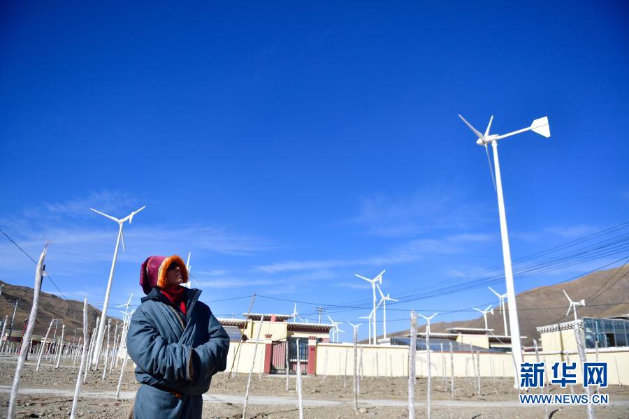 1月11日,隆亞村村支部書記貢保多杰在查看搬遷點的風(fēng)力發(fā)電機組運行情況。新華社記者 張龍 攝