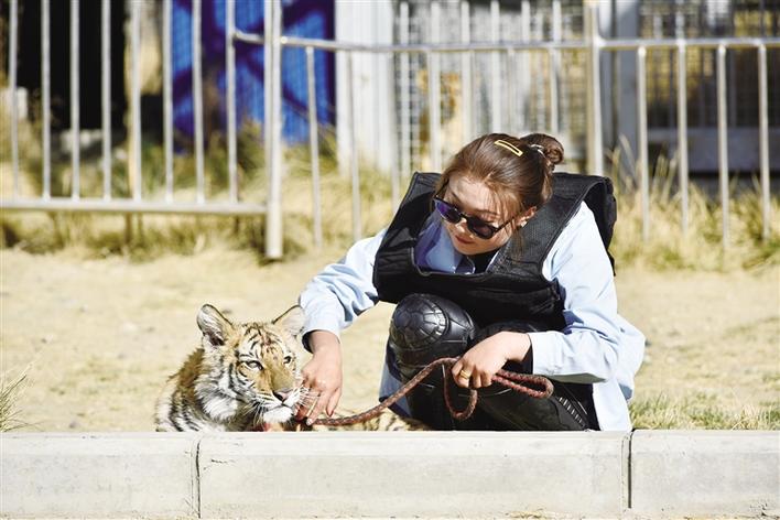 當(dāng)記者看到四只幼獅時,它們時而聚在一起,時而沿著籠子邊溜達,時而張開大嘴向著外人示威,還有一個非常活躍的在攀爬籠子。小老虎次仁卓瑪雖然沒有兄弟姐妹的陪伴,不過園區(qū)的獸醫(yī)小姐姐成了它最貼心的玩伴。每天,獸醫(yī)小姐姐都會帶著次仁卓瑪進行戶外活動,次仁卓瑪像小朋友一樣喜歡玩皮球,喜歡追著獸醫(yī)小姐姐跑,還特別喜歡獸醫(yī)小姐姐給它按摩,經(jīng)常會撒嬌求抱抱。