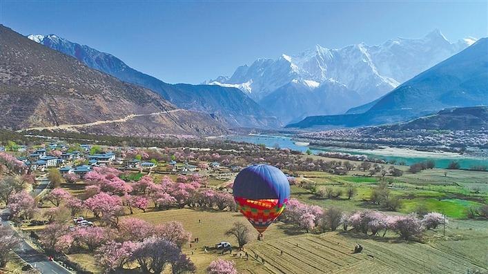 林芝市米林縣吞白村,很多游客選擇乘坐熱氣球觀賞桃花。 王珊 扎洛 攝