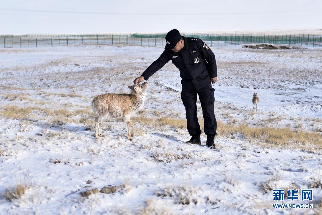 4月20日,袁廣明在可可西里藏羚羊救助站與被救助的藏羚羊在一起。新華社記者 費茂華 攝