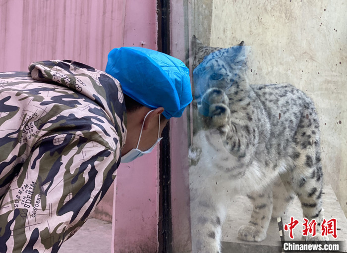 11月5日,史壽軍隔著玻璃與雪豹互動。 中新社記者 李江寧 攝