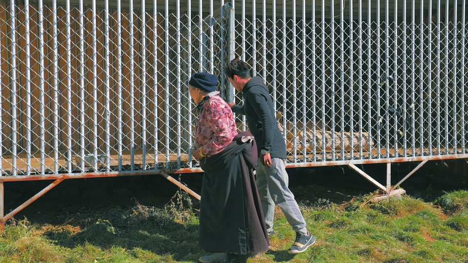 “在巖壁下發(fā)現(xiàn)了它,因?yàn)榱餮^(guò)多已經(jīng)奄奄一息了。它的一個(gè)前肢斷了,現(xiàn)在走路還是一瘸一拐的?!蓖瑸樽o(hù)林員的根呷介紹,當(dāng)時(shí)這只雪豹在同另外一只雪豹搶食落敗后受傷,因?yàn)檎孢_(dá)鄉(xiāng)尚未建立動(dòng)物救助中心,雪豹便寄養(yǎng)在甲它家中。鄉(xiāng)政府出資修建了雪豹居住的“鐵籠”,甲它負(fù)責(zé)給它喂食,甲它的妻子則每隔一段時(shí)間就要為這頭猛獸打掃一次圈舍。