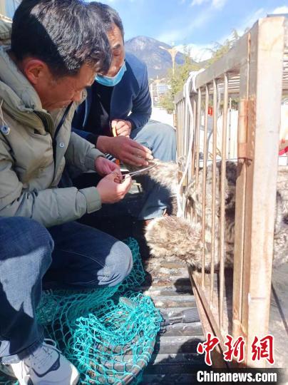 圖為工作人員將雪豹運送至林芝市野生動物收容救護站?!×种ナ辛植菥止﹫D