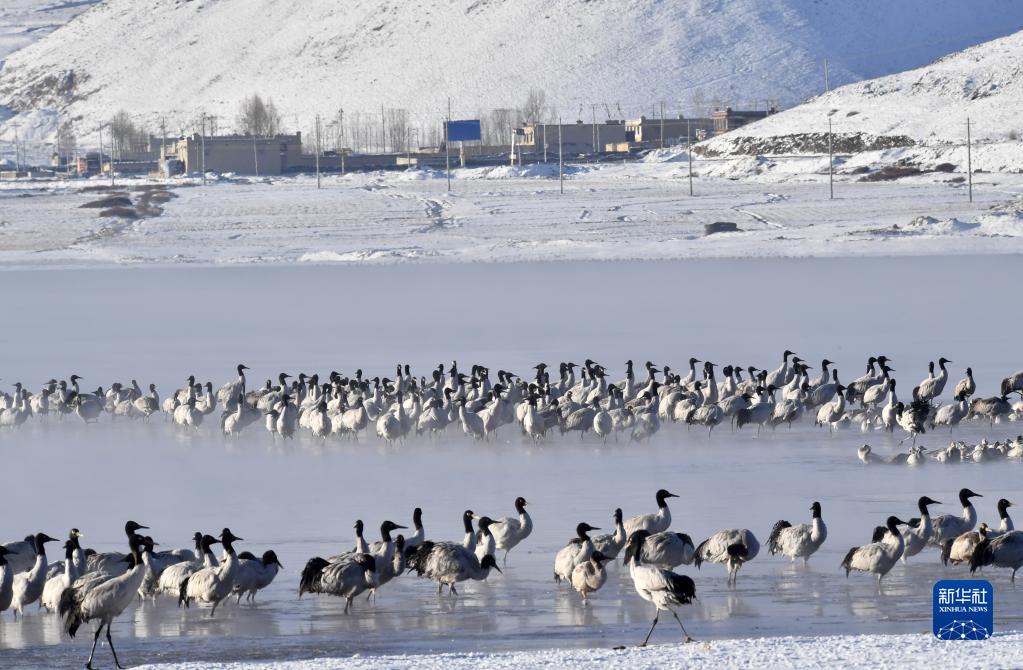 在拉薩市林周縣境內(nèi)越冬的黑頸鶴(2月22日攝)。新華社記者 姜帆 攝