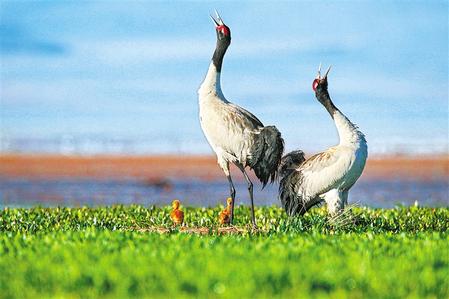 棲息在尕海濕地的國家一級保護(hù)動物黑頸鶴。 新甘肅·甘肅日報通訊員 張勇