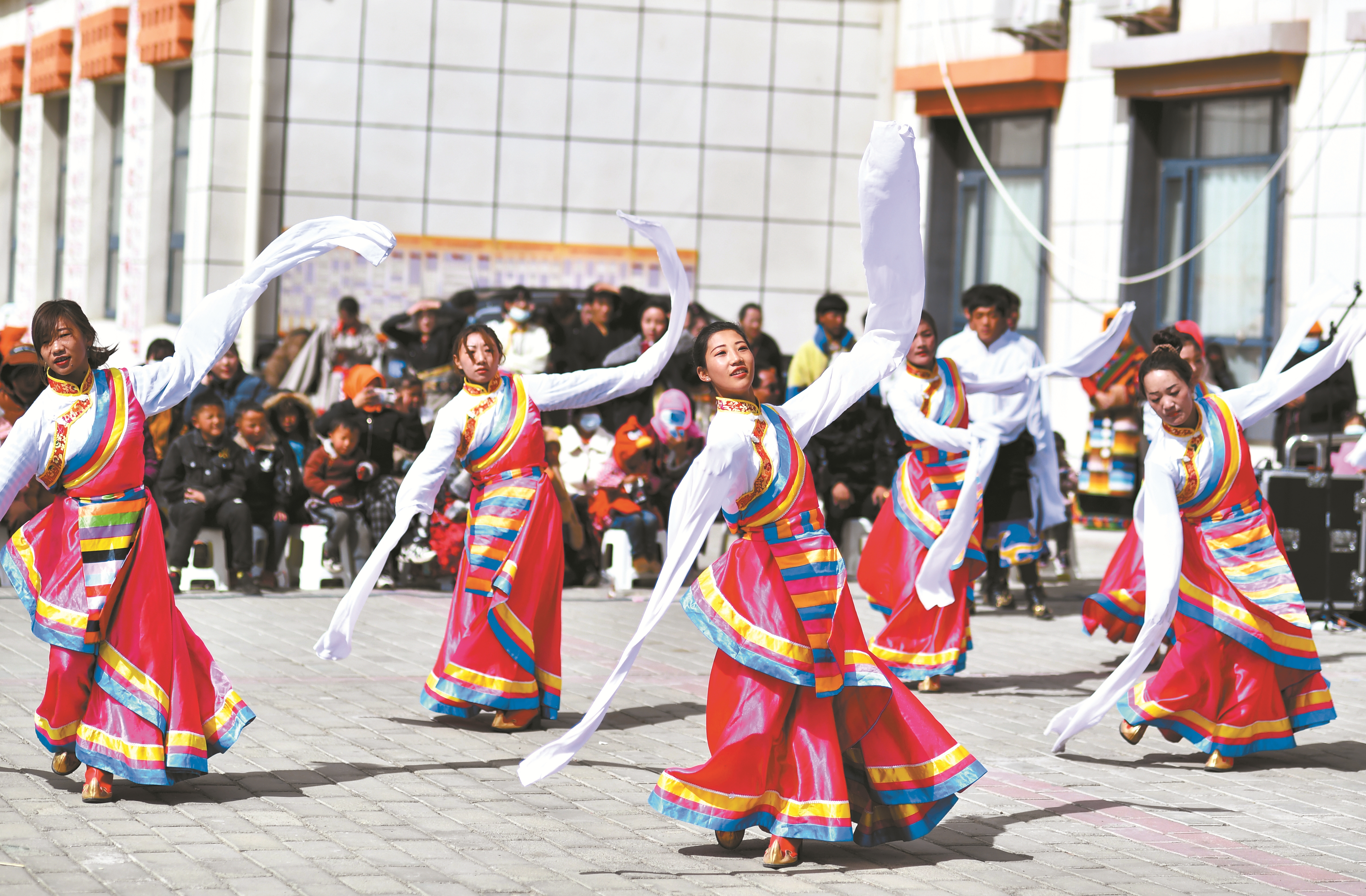 圖為搬遷牧民在搬遷點(diǎn)廣場上跳起民族舞蹈,迎接藏歷新年(2月28日攝)。新華社記者 覺 果攝