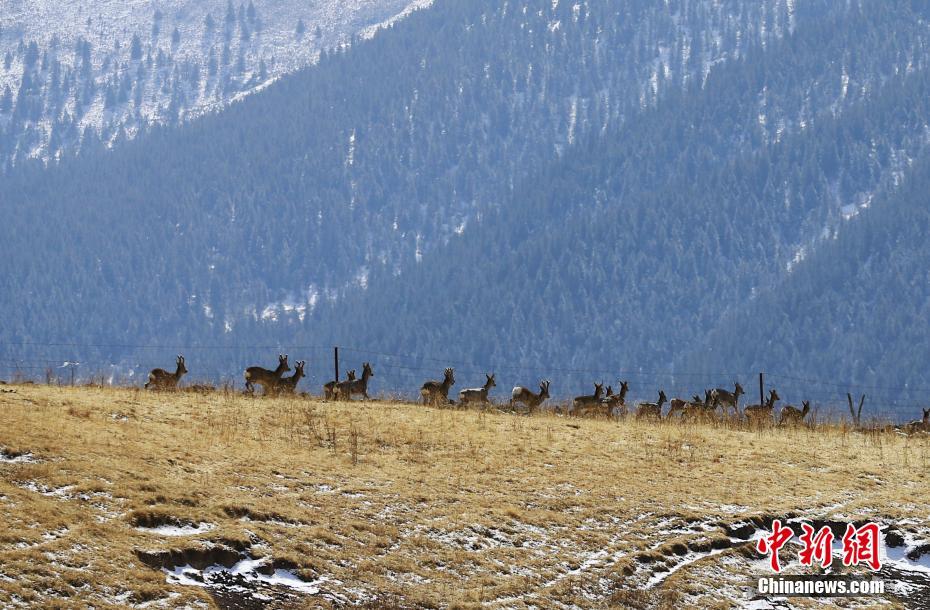 3月16日,成群的矮鹿在青海省海北藏族自治州祁連山國家公園青海片區(qū)草場(chǎng)上嬉戲。祁連山國家公園地處中國青海、甘肅兩省交界,總面積5.02萬平方千米,其中青海片區(qū)1.58萬平方千米。近年來,隨著當(dāng)?shù)厣鷳B(tài)環(huán)境持續(xù)改善,祁連山國家公園青海片區(qū)珍稀野生動(dòng)物種群數(shù)量不斷增加。 中新社記者 馬銘言 攝