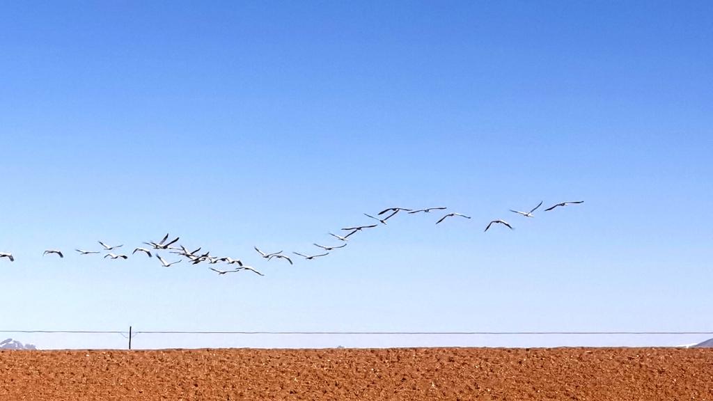 蓑羽鶴生性機警,記者所乘車輛在約百米遠(yuǎn)處剛停下,成群的蓑羽鶴便展翅高飛,發(fā)出陣陣鳴叫,急急地向東北方向飛去。