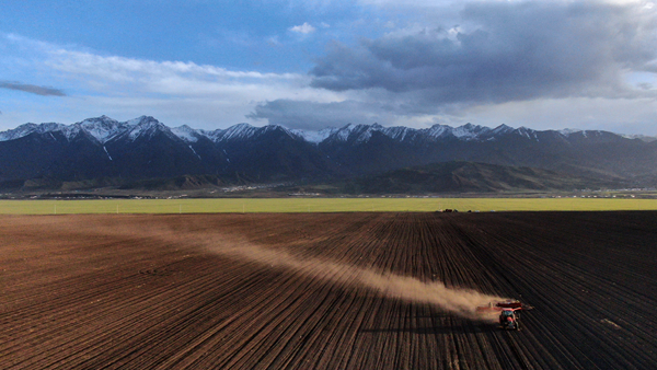 青海省三江集團(tuán)門源種馬場(chǎng)的工人駕駛農(nóng)機(jī)在油菜田里播種(無人機(jī)照片)。記者 張宏祥 攝