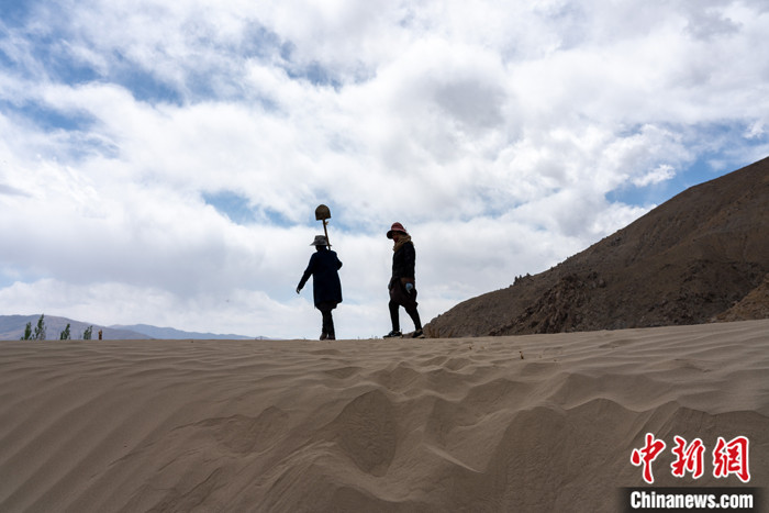 圖為4月18日,西藏雅魯藏布江畔的農牧民植完樹后行走在一處沙丘上。 中新社記者 江飛波 攝