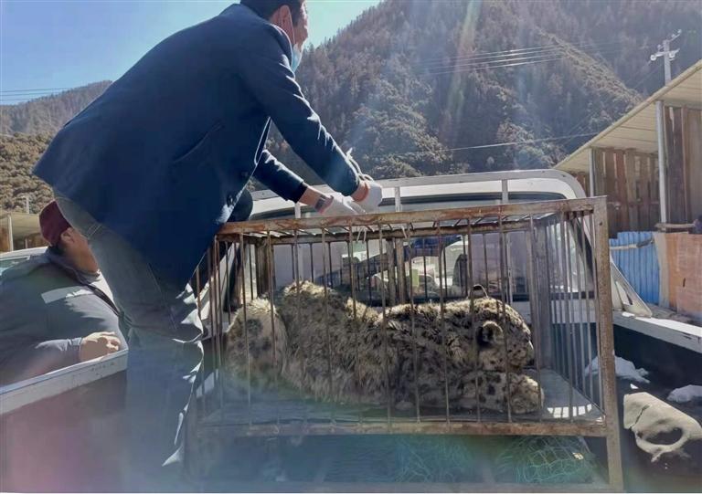 圖為工作人員將雪豹運送至林芝市野生動物收容救護站。 (西藏自治區(qū)林業(yè)和草原局提供)
