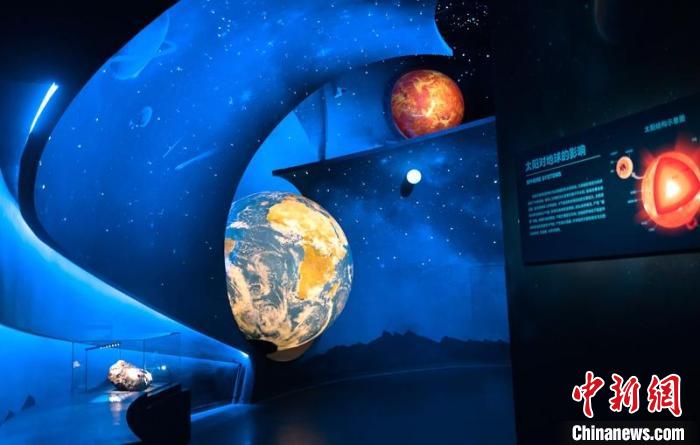邁步進入“地質環(huán)境廳”,最最吸睛的,是一個巨大的、緩慢旋轉的“地球”,在深藍色的夜空背景下,地球上的紋理分毫畢現(xiàn)。頂層用微型燈組成的“星空”時不時有流星劃過,照亮了太陽系的其他行星。整個太陽系被高仿真還原,帶光環(huán)的土星、赤紅色的火星、體積最大的木星……