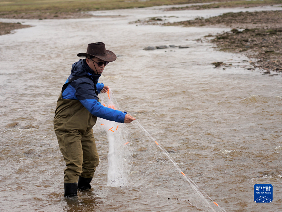 6月12日,李偉在長江南源當(dāng)曲河畔采集發(fā)育成熟的小頭裸裂尻魚。新華社記者 陳杰 攝